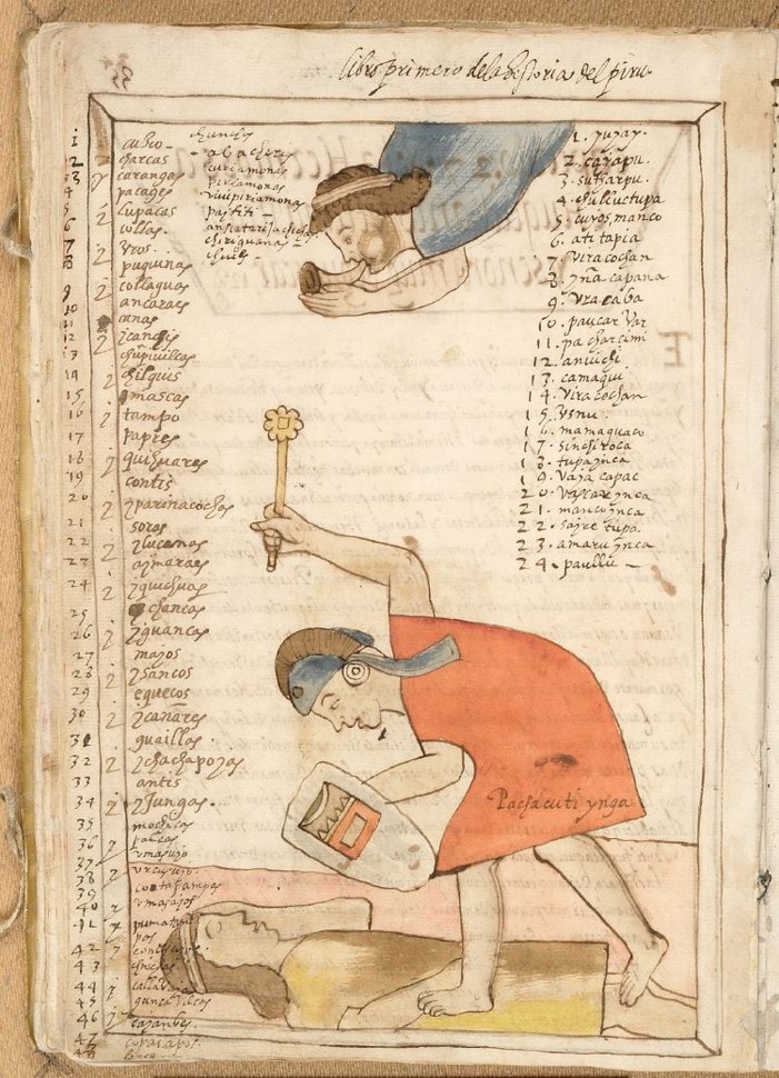 While Murúa’s Historia General del Piru, known as the Getty Murúa, is the final edition of his work, the lesser-known Galvin Murúa, an incomplete version published in 1590, contains several images not included in the final copy, including this one of Pachacuti Ynga clubbing a fallen soldier while an angel with a horn flies above. Accompanying the image is a list of places and communities conquered by the Incas.